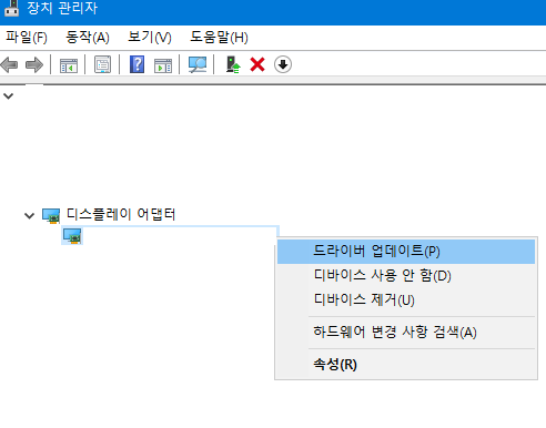 장치 관리자에서 디스플레이어댑터를 누르면 자신이 연결되어있는 것에 따라 내장그래픽이거나 외장그래픽이 나올 것이다. 우클릭 하여 드라이버 업데이트를 하면된다. 드라이버자동검색후에 알아서 다 설치해준다.