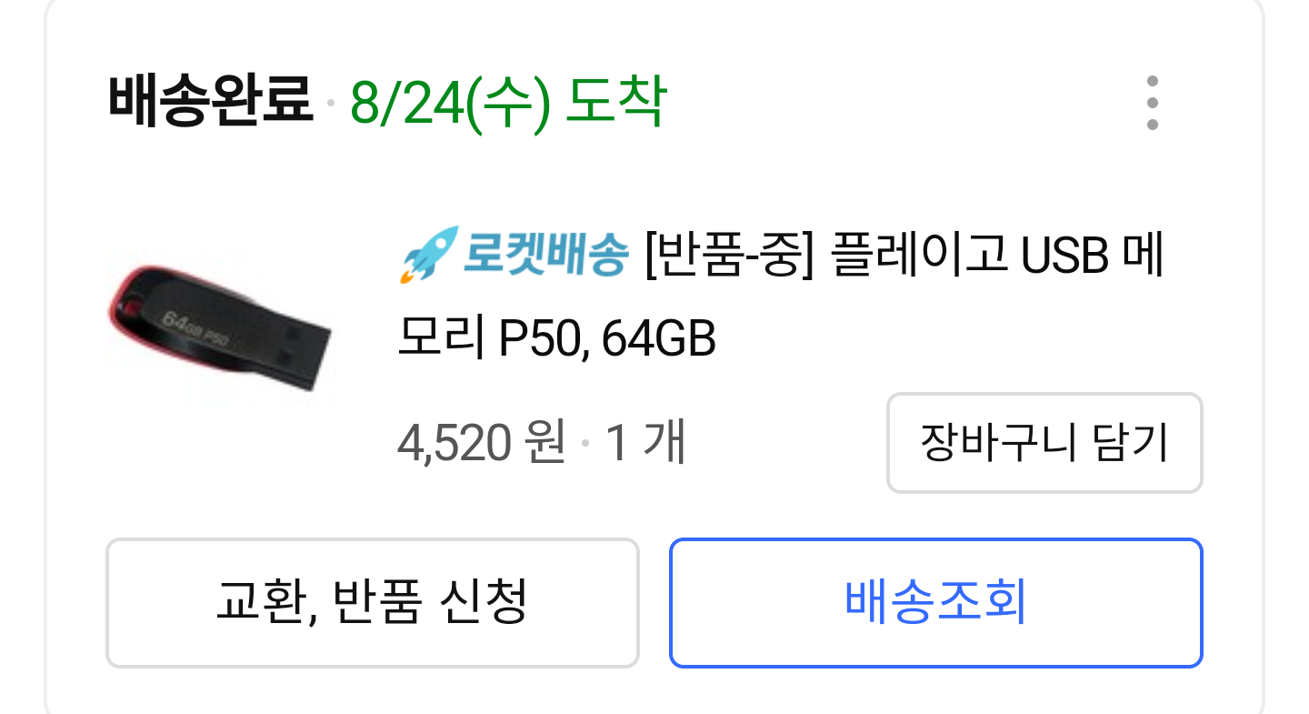 백업용으로 사용할 거라 싼 것 중에 나무위키의 usb 메모리에서 관련 회사 항목에 있는 회사기도 해서 아예 이름 없지는 않은 거 같아서 적당하다고 생각했고, 이걸로 선택했다. 사는 김에 쿠팡에서는 반품된 로켓 배송 제품을 싸게 원래 가격보다 싸게 파는데 그것도 궁금해서 반품 상품을 사 보기로 하였다.