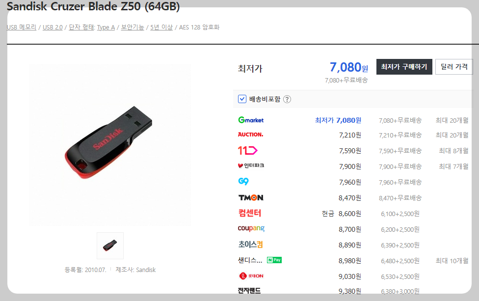 다나와 기준 64GB 제일 싼 usb는 7080원에 구매할 수 있다.