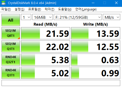 로 확실히 더 높은 결과를 보여주지만, usb자체가 그 속도가 항상 일정하게 나오지는 않는지라, usb2.0이면 다 고만고만하다고 본다. 그런데 같은 제품을 대량 생산해서 여기저기 뿌리는 그런 건줄 알았는데 겉 플라스틱만 같고 안에 칩은 다른가 보다 ㅜ..