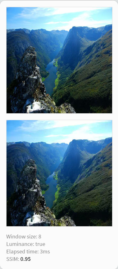그래서 이미지 품질 평가를 위한 방법으로 화질차이 및 유사도를 확인해주는 값인 SSIM을 비교한 결과 아래의 사진과 같이 0.95로 나온다. (1일 경우 사진이 같다는 걸 뜻함.)