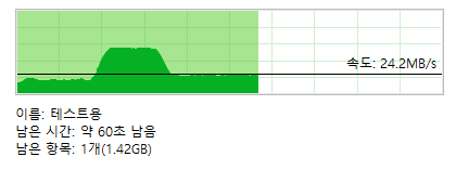 초기 속도가 17MB나오다가 사진 보면 중간에 툭 위로 솟은 구간이 있는데 저게 60MB정도 나왔는데 저런 구간은 얼마 유지못하고 나중에는 24MB정도 속도를 유지하였다.