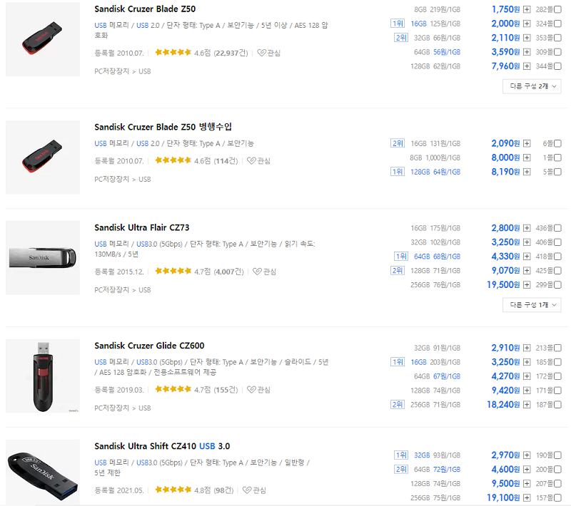 sandisk usb를 가격낮은 순으로 검색해보면 usb2.0메모리인 z50빼면 usb3.0메모리로 cz73이 제일 낮은 가격을 형성하고 있다.